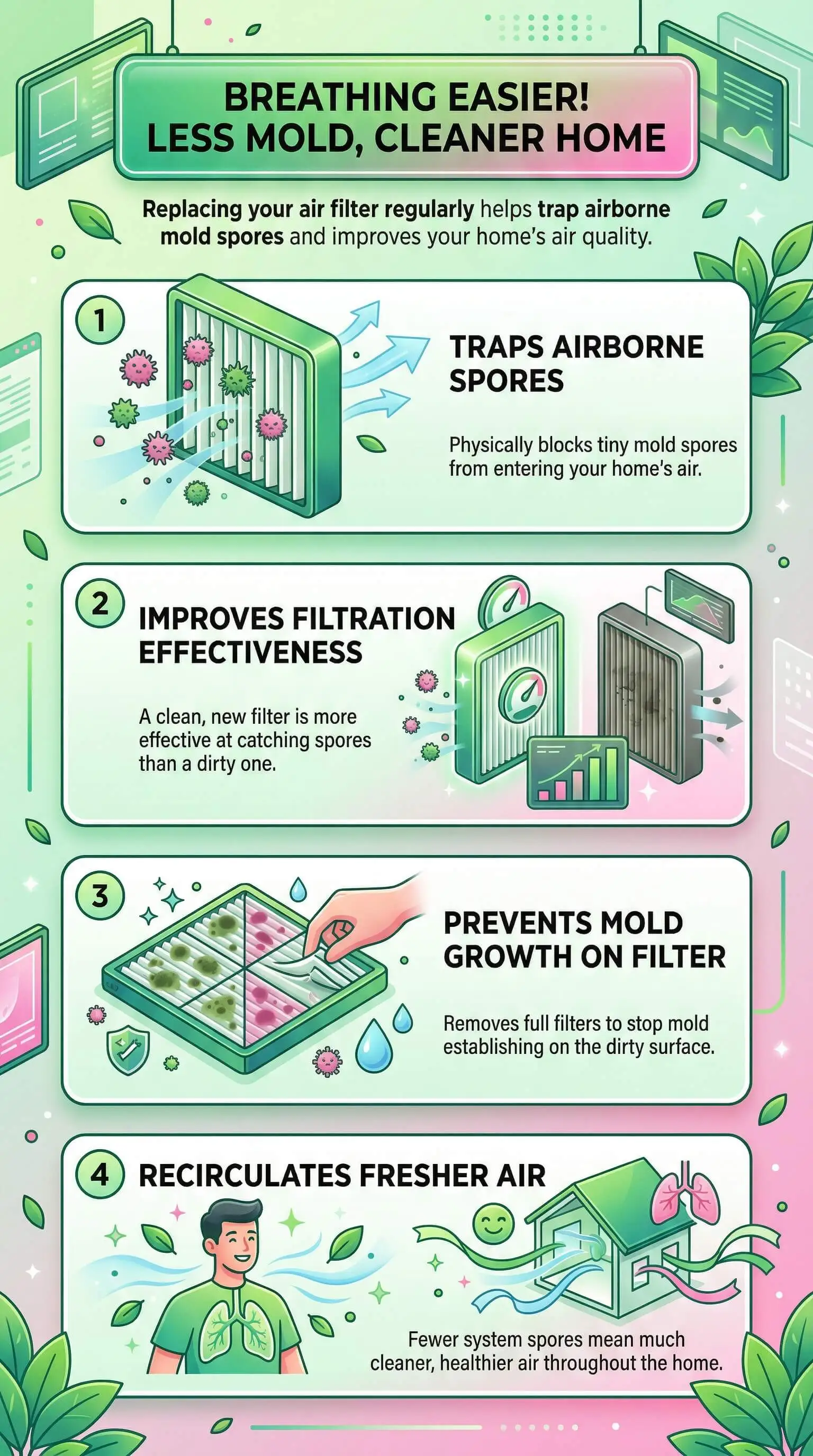Replacing your air filter reduces airborne mold spores — but only when paired with the right MERV rating and a consistent change schedule. Here is what to know: